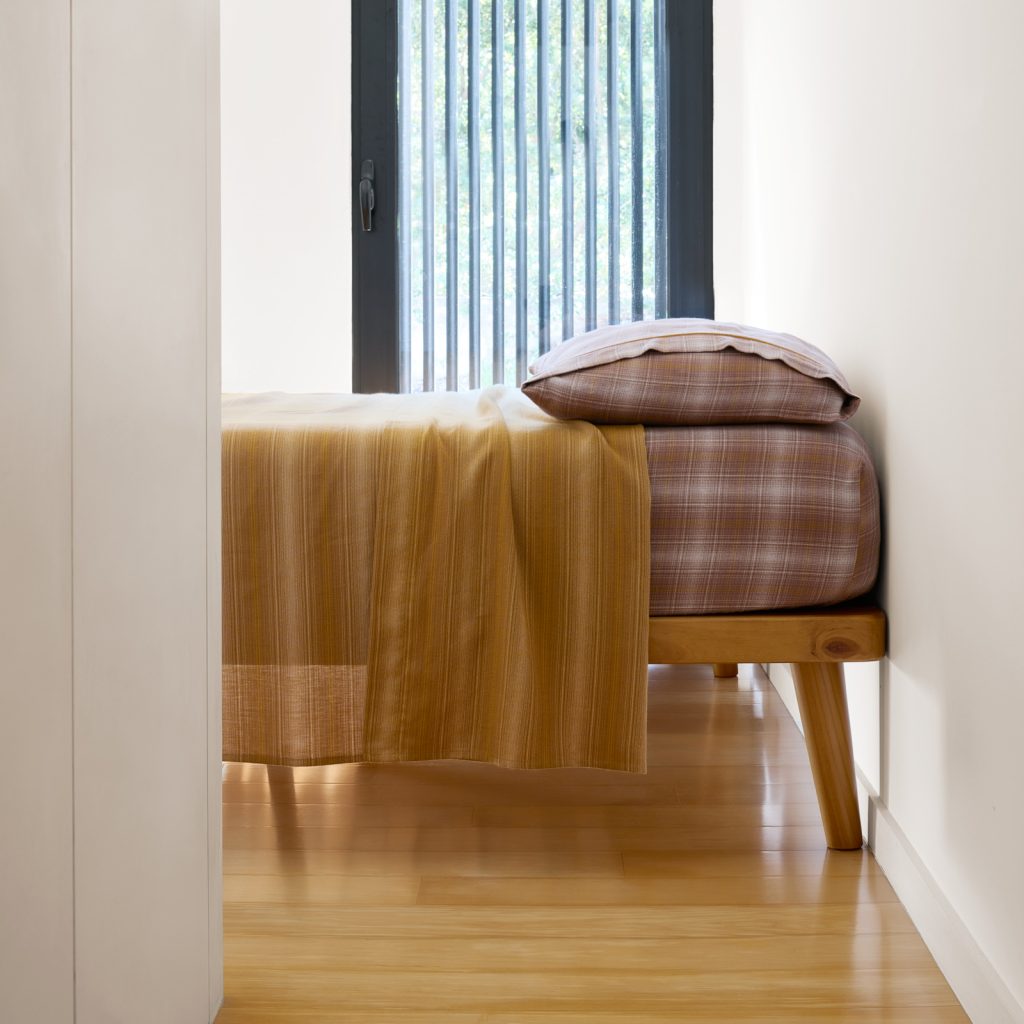 The Holos Smooth Top Sheet combines elegance, comfort, and versatility, designed to transform the bed with an exclusive look while providing well-being. Available in two distinct color versions, amber, which warms and brightens the space, and light beige, which conveys serenity and neutrality, this piece adapts easily to different environments, allowing you to create cozier or more minimalist atmospheres according to personal preference. Its subtle, youthful pattern with soft stripes, alternating between intense and gentle tones, adds dynamism and depth without losing delicacy. This balance between intensity and lightness makes the Holos Smooth Top Sheet so special and original, a sheet that adds personality to the bed while maintaining a discreet and elegant aesthetic. Made from 100% BCI cotton flannel, it offers a soft, enveloping, and cozy touch, ideal for nights that call for warmth and comfort. The pleasant texture, combined with high-quality cotton, ensures lasting comfort and durability while reflecting a commitment to sustainable and responsible materials. Versatility is another standout feature of this piece. The Holos Smooth Top Sheet was designed to coordinate easily with different designs from the collection, offering freedom of choice and flexibility. Whether in subtle tonal combinations or bolder contrasts, this sheet is the perfect foundation for creative and sophisticated bed arrangements.