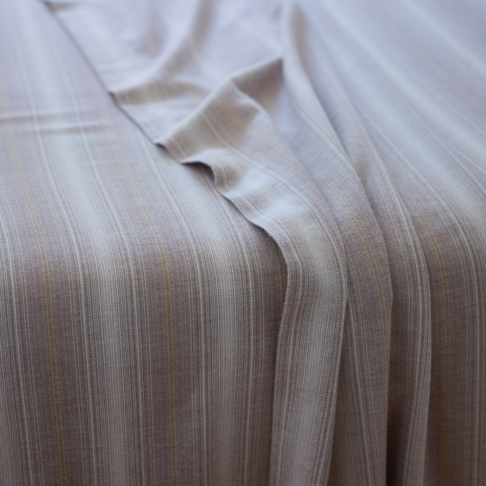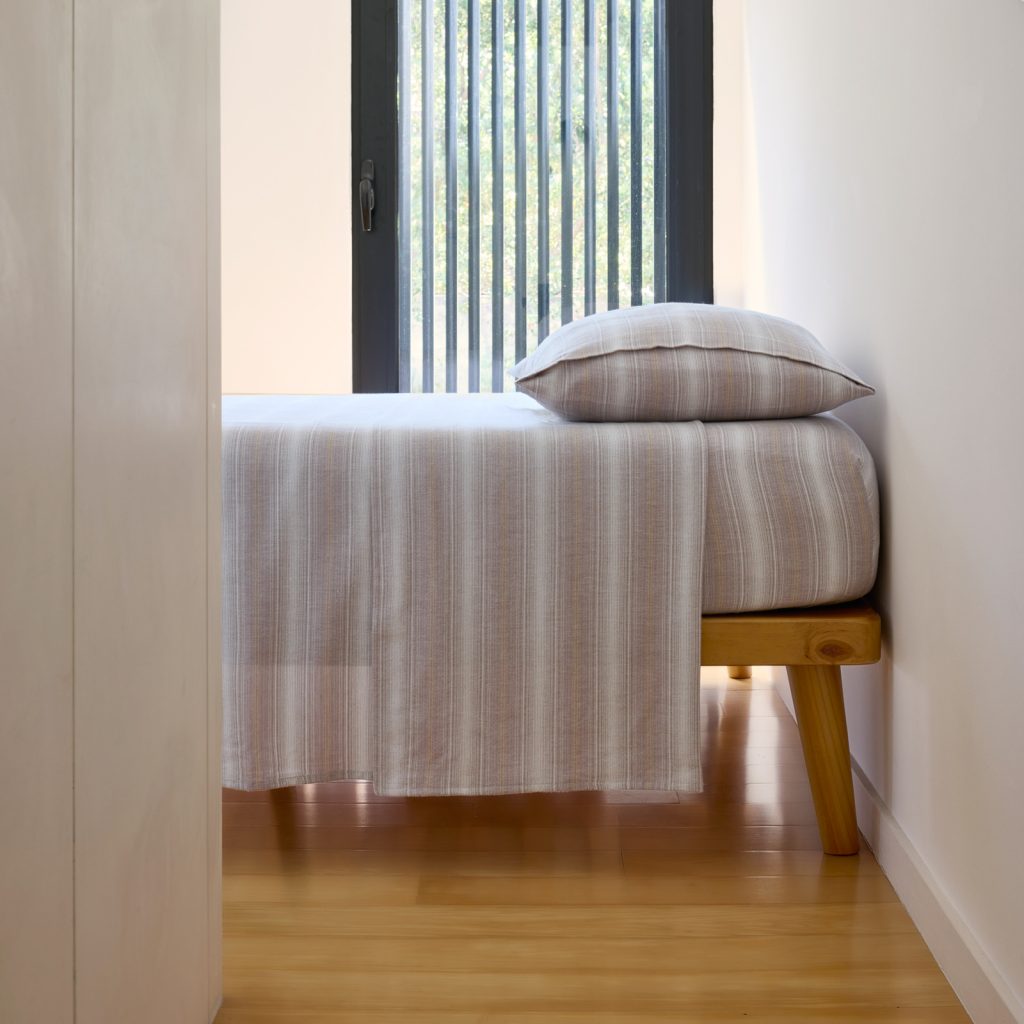 The Holos Smooth Top Sheet combines elegance, comfort, and versatility, designed to transform the bed with an exclusive look while providing well-being. Available in two distinct color versions, amber, which warms and brightens the space, and light beige, which conveys serenity and neutrality, this piece adapts easily to different environments, allowing you to create cozier or more minimalist atmospheres according to personal preference. Its subtle, youthful pattern with soft stripes, alternating between intense and gentle tones, adds dynamism and depth without losing delicacy. This balance between intensity and lightness makes the Holos Smooth Top Sheet so special and original, a sheet that adds personality to the bed while maintaining a discreet and elegant aesthetic. Made from 100% BCI cotton flannel, it offers a soft, enveloping, and cozy touch, ideal for nights that call for warmth and comfort. The pleasant texture, combined with high-quality cotton, ensures lasting comfort and durability while reflecting a commitment to sustainable and responsible materials. Versatility is another standout feature of this piece. The Holos Smooth Top Sheet was designed to coordinate easily with different designs from the collection, offering freedom of choice and flexibility. Whether in subtle tonal combinations or bolder contrasts, this sheet is the perfect foundation for creative and sophisticated bed arrangements.