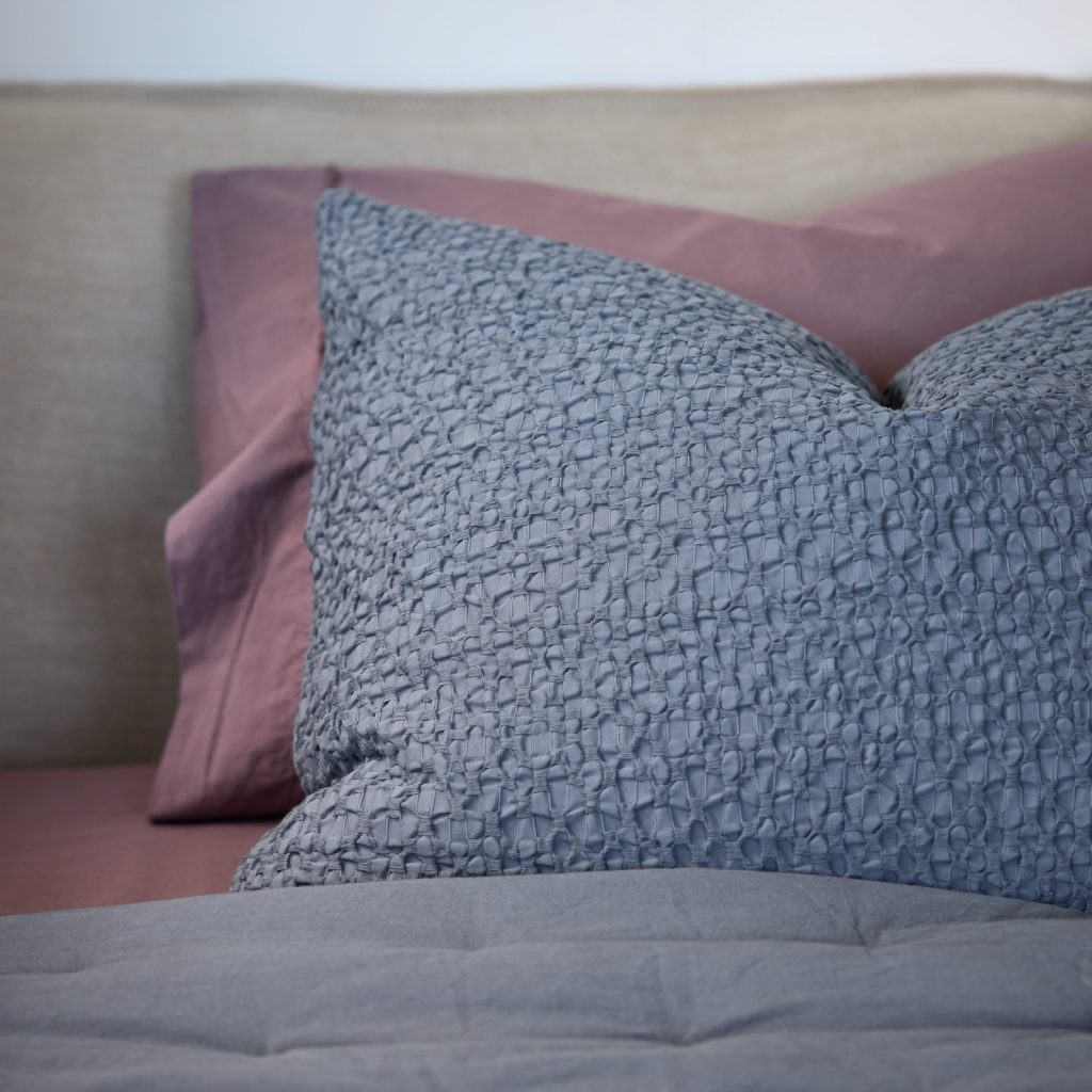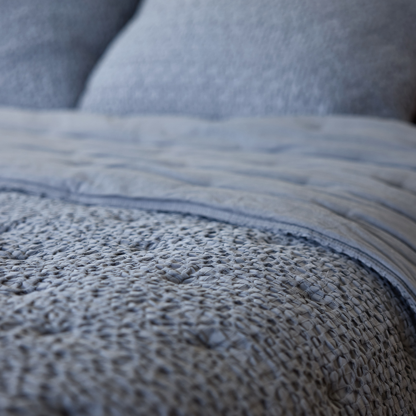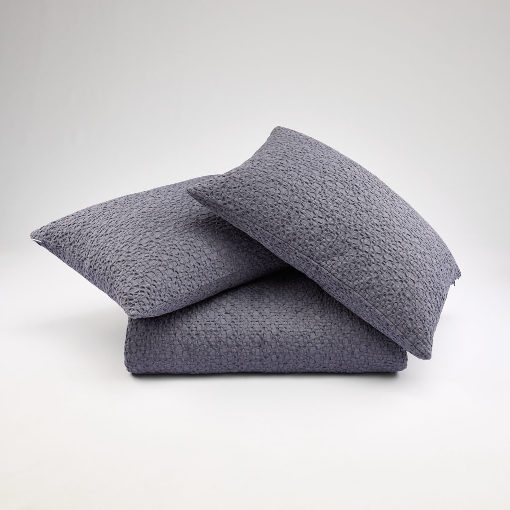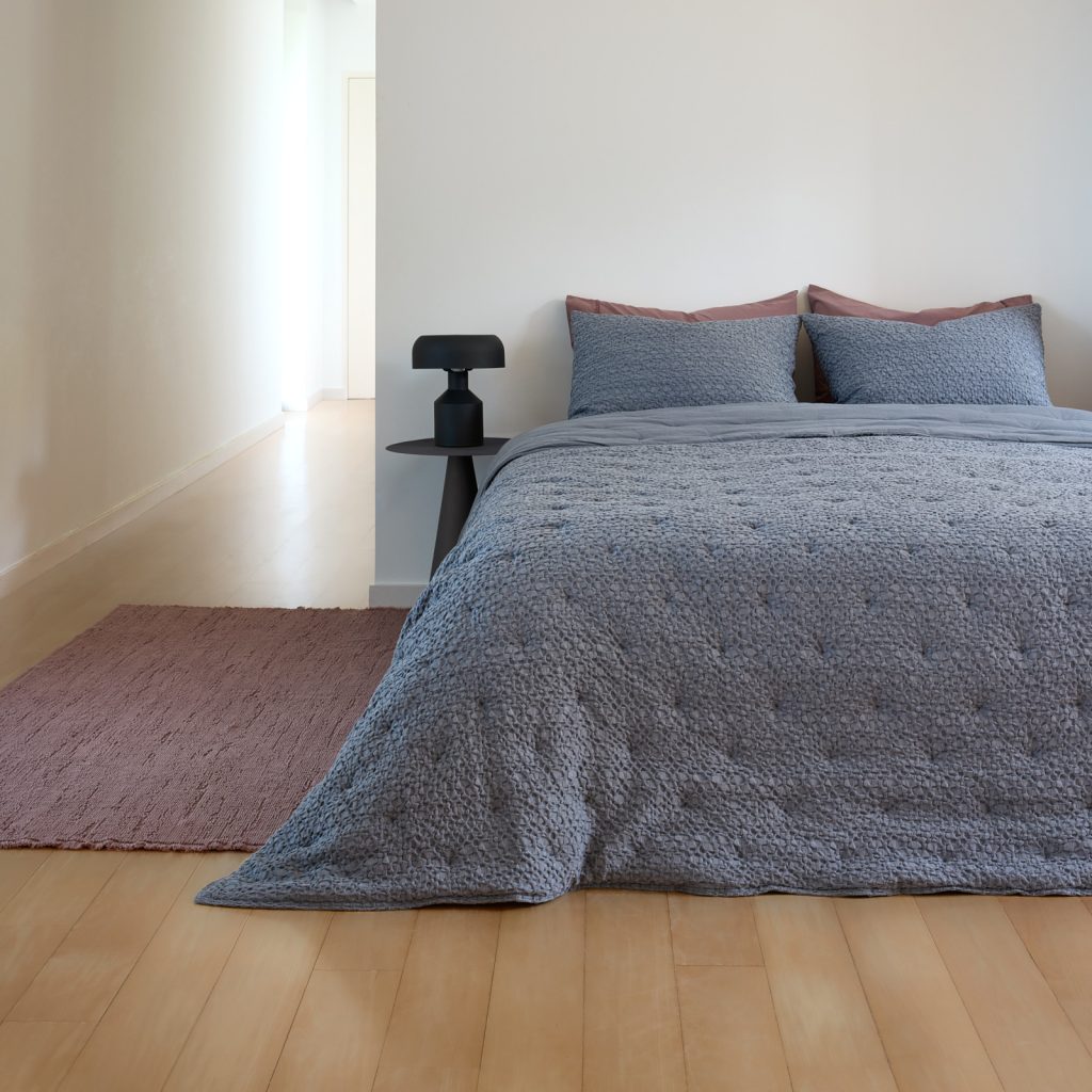 The Canoas Quilt shows how harmony can exist between simplicity and detail. Developed in two distinct tones, smoky grey, a shade that conveys sobriety, elegance, and timelessness, and amber, which warms and illuminates the room, this quilt celebrates the balance between colors and textures, inviting relaxation and contemplation. Its double-sided design, keeping the same color on both sides, reinforces a clean, contemporary aesthetic, making it versatile and easy to integrate into any setting, from minimalist to more elaborate styles. Its uniqueness lies in the different thread thicknesses and tensions, which create a subtle play of textures. This detail gives the fabric a handcrafted, organic character, visually recreating the gentle rippling of water, just as its name suggests. A quilt that invites rest. Lying under its warm and serene colors is to feel time slow down, as if life’s rhythm followed the smooth glide of a canoe over water. The simplicity of its form contrasts with the richness of the sensory experience it provides, making every moment of rest deeper and more memorable. In addition, its garment-dyeing process gives each piece a unique and exclusive color and greater durability, as well as superior quality and an extra-soft touch.