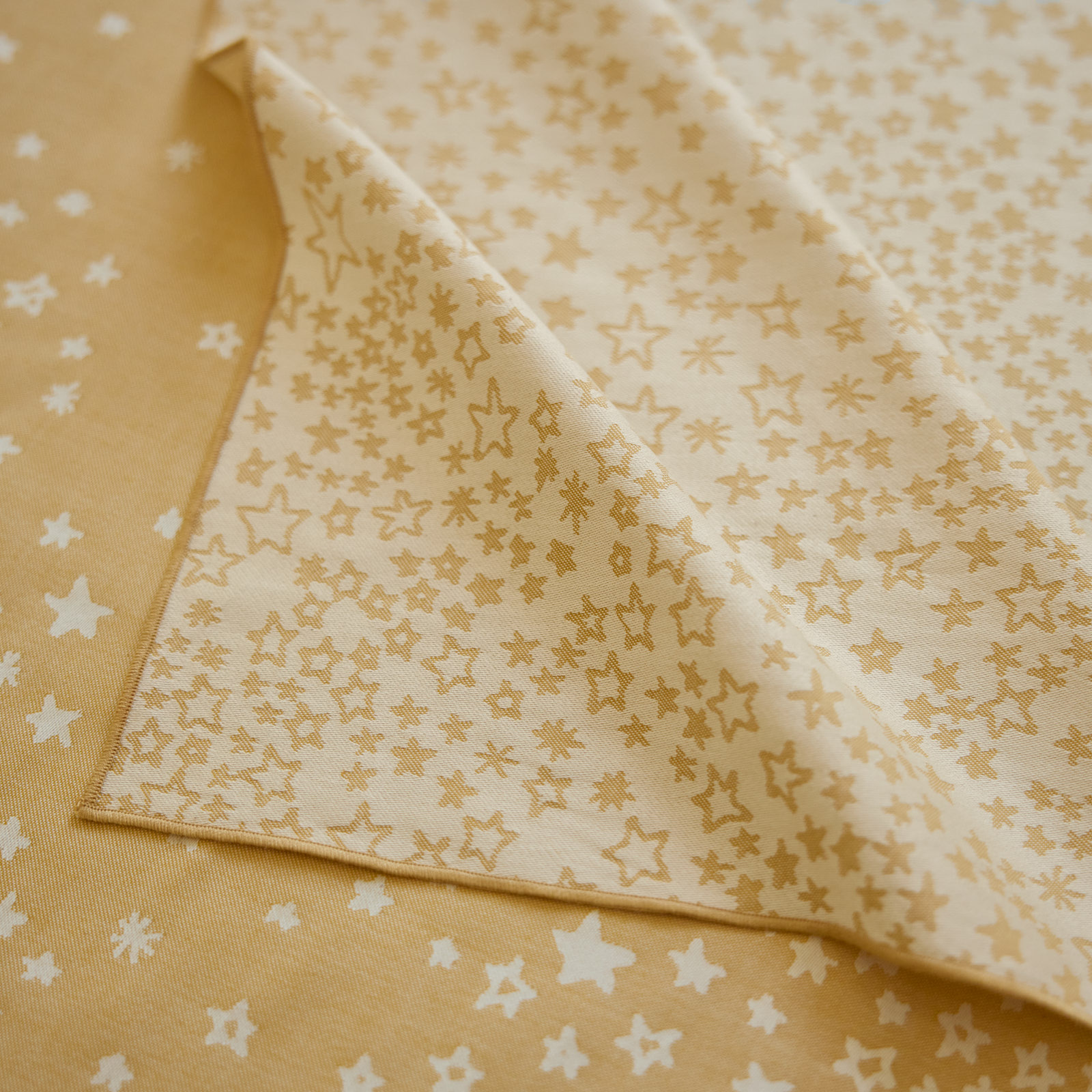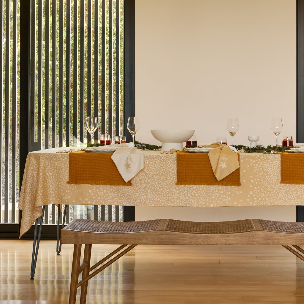 The Constellation Tablecloth celebrates the sparkle and energy of this magical season, reinterpreting the festive spirit through a contemporary and luminous aesthetic. Designed in an elegant shade of yellow, this piece radiates warmth and joy, evoking the starlight that inspired its authorial design, a dynamic motif, full of movement and life, that seems to dance in the glow of every shared meal. The double-faced construction adds versatility and sophistication: two distinct yet harmoniously coordinated sides that allow for different ambiances with the same piece. The color-matched rolled hem reinforces the handcrafted care of its making, revealing the attention to detail that defines Season. Its deep yellow hue recalls the warmth of Christmas lights, the comfort of illuminated homes, and the optimism that marks the end of the year. At the same time, the star-inspired pattern, with its subtly artistic language, brings a poetic and timeless dimension that transcends Christmas, making it perfect for other festive occasions as well. This tablecloth blends texture and fluidity, offering an elegant drape and a pleasant touch, instantly setting the table in a festive mood and turning it into the heart of shared emotions, a place where the glow shines not only through candles and holiday lights but also through the texture, color, and harmony of the tablecloth itself.