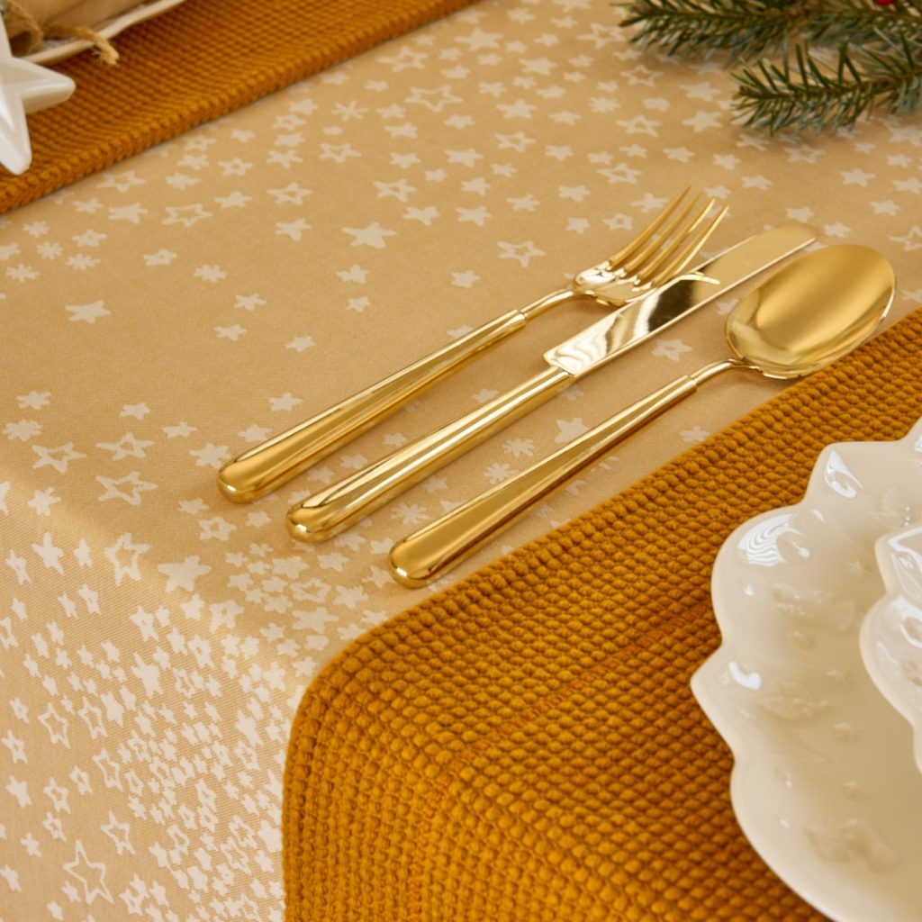The Constellation Tablecloth celebrates the sparkle and energy of this magical season, reinterpreting the festive spirit through a contemporary and luminous aesthetic. Designed in an elegant shade of yellow, this piece radiates warmth and joy, evoking the starlight that inspired its authorial design, a dynamic motif, full of movement and life, that seems to dance in the glow of every shared meal. The double-faced construction adds versatility and sophistication: two distinct yet harmoniously coordinated sides that allow for different ambiances with the same piece. The color-matched rolled hem reinforces the handcrafted care of its making, revealing the attention to detail that defines Season. Its deep yellow hue recalls the warmth of Christmas lights, the comfort of illuminated homes, and the optimism that marks the end of the year. At the same time, the star-inspired pattern, with its subtly artistic language, brings a poetic and timeless dimension that transcends Christmas, making it perfect for other festive occasions as well. This tablecloth blends texture and fluidity, offering an elegant drape and a pleasant touch, instantly setting the table in a festive mood and turning it into the heart of shared emotions, a place where the glow shines not only through candles and holiday lights but also through the texture, color, and harmony of the tablecloth itself.