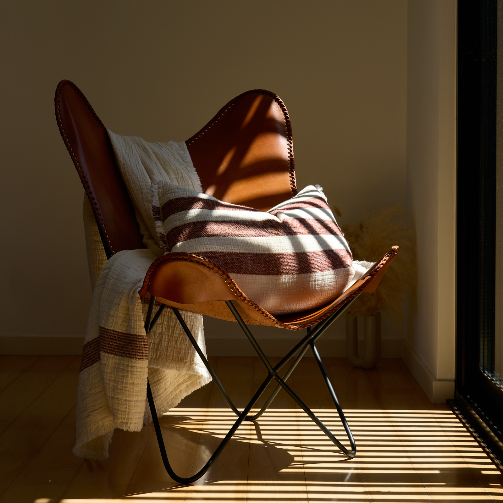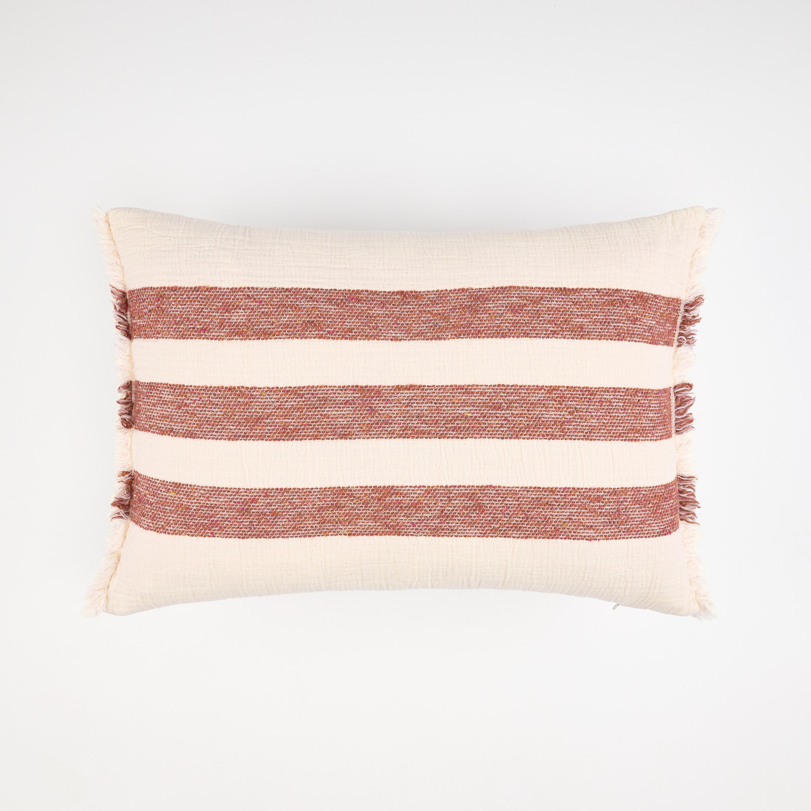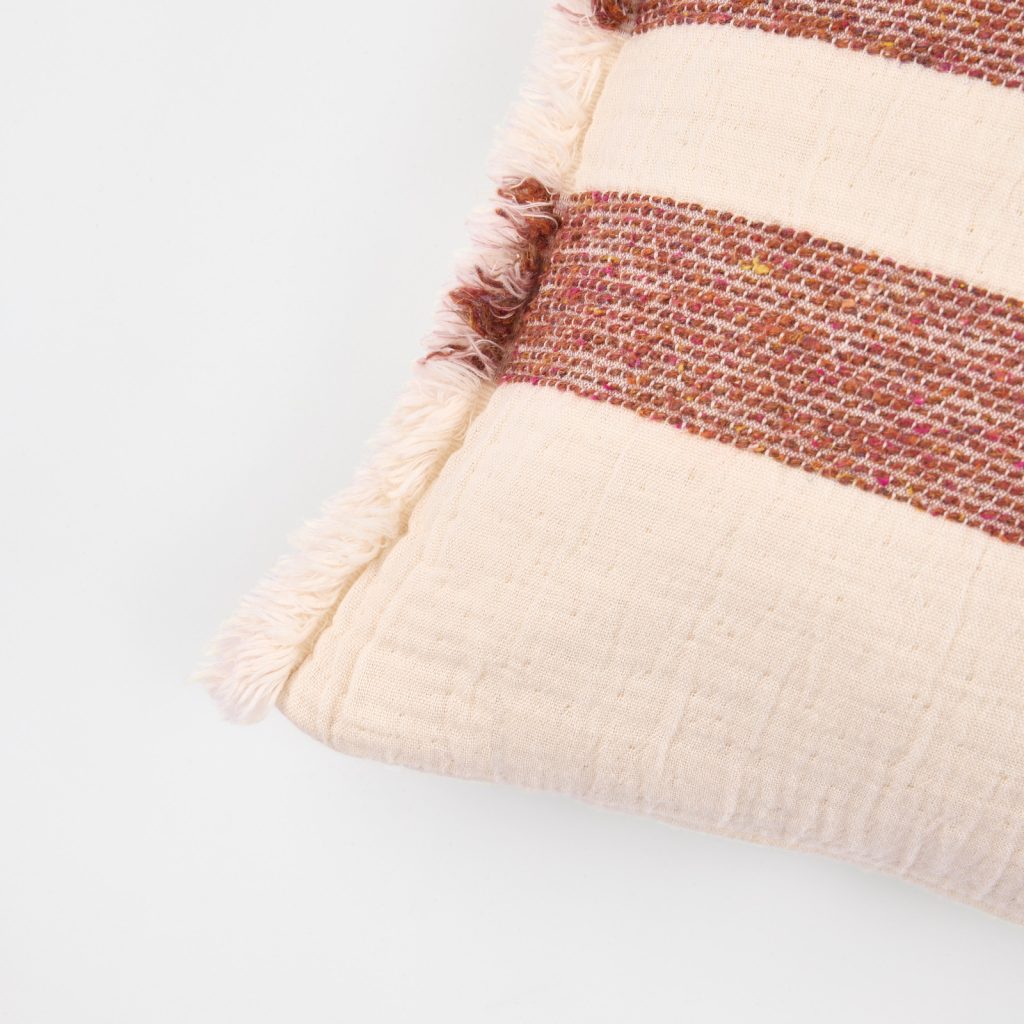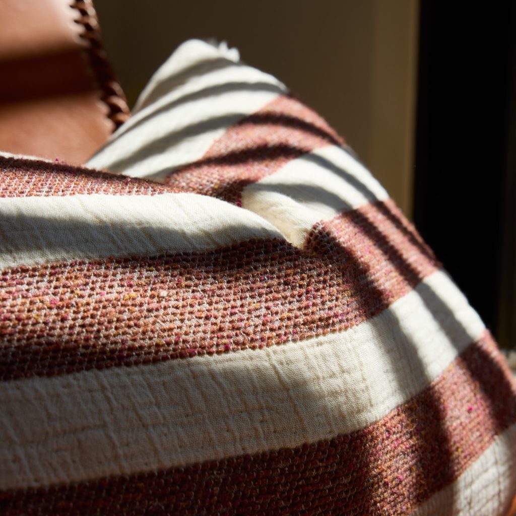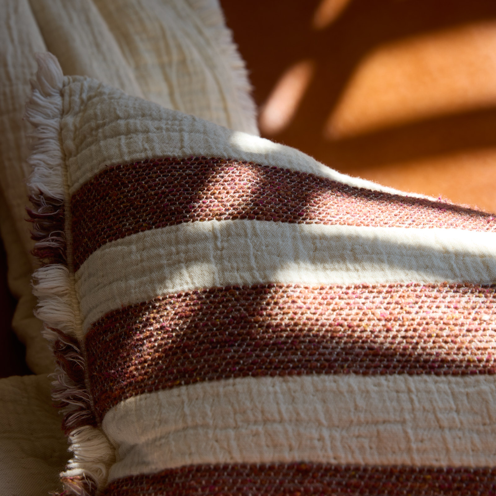 The Melasso Cushion is the perfect addition to bring both coziness and sophistication to any space. Crafted from a refined blend of virgin wool, silk, cotton, and viscose, it combines softness, warmth, and durability, offering the very best of its luxurious fibers: the gentle warmth of wool, the delicacy and luminosity of silk, the freshness of cotton, and the fluidity of viscose. Its distinctive charm lies in the special yarn accents, brought to life through delicate multicolored neps. These subtle details create a textured and dynamic surface, both to the eye and to the touch, adding character and originality to the piece. Discreet and elegant fringes placed along the sides further enhance the authenticity of its design. Versatile and timeless, it adapts beautifully to minimalist interiors, where it stands out for its singularity, or to bolder settings, where it amplifies comfort and personality. Pair it with the Melasso Throw in the same pattern and design to achieve a harmonious look and create a cozy retreat filled with softness and warmth. The garment wash process that the item goes through after being made gives it an extra soft and textured feel.