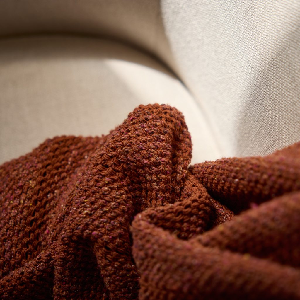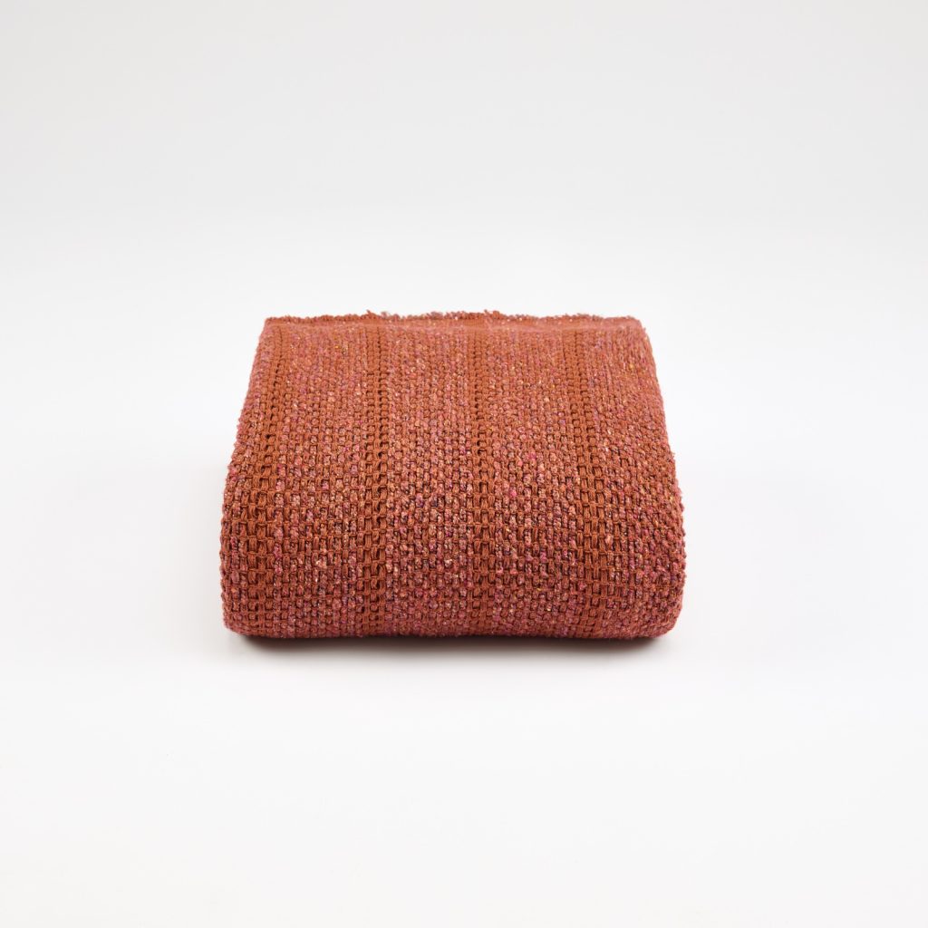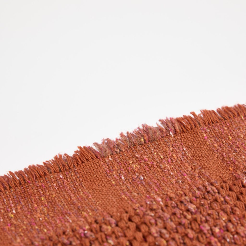 The Cute Melcut Throw is designed to bring comfort, style, and a touch of personality to your moments of rest. Crafted from a refined blend of natural fibers, virgin wool, silk, cotton, and viscose, it combines softness, warmth, and lightness in a unique piece that suits both colder days and year-round relaxation. Each fiber discreetly contributes to its distinctive feel: wool provides warmth, silk adds smoothness, cotton ensures freshness, and viscose offers fluidity and durability. A special yarn with multicolored neps enriches the fabric with texture and movement, turning the throw into a decorative element that stands out and adds vibrancy to any space. In terracotta tones, it visually warms the environment while infusing character and coziness, making it the perfect piece to add life and color to monochromatic settings. Whether draped over sofas, armchairs, or placed on the bed, it enhances both comfort and style. Finished with subtle fringes at the ends, the Cute Melcut Throw gains a light, elegant touch that completes its aesthetic. The garment wash process that the item goes through after being made gives it an extra soft and textured feel.