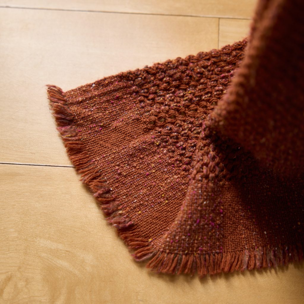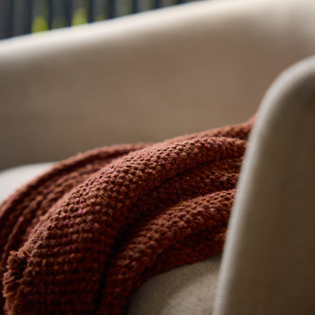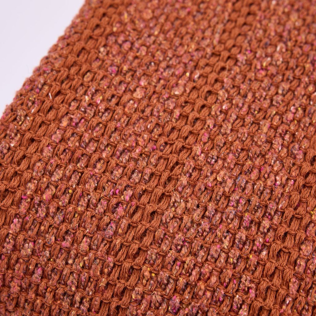 The Cute Melcut Throw is designed to bring comfort, style, and a touch of personality to your moments of rest. Crafted from a refined blend of natural fibers, virgin wool, silk, cotton, and viscose, it combines softness, warmth, and lightness in a unique piece that suits both colder days and year-round relaxation. Each fiber discreetly contributes to its distinctive feel: wool provides warmth, silk adds smoothness, cotton ensures freshness, and viscose offers fluidity and durability. A special yarn with multicolored neps enriches the fabric with texture and movement, turning the throw into a decorative element that stands out and adds vibrancy to any space. In terracotta tones, it visually warms the environment while infusing character and coziness, making it the perfect piece to add life and color to monochromatic settings. Whether draped over sofas, armchairs, or placed on the bed, it enhances both comfort and style. Finished with subtle fringes at the ends, the Cute Melcut Throw gains a light, elegant touch that completes its aesthetic. The garment wash process that the item goes through after being made gives it an extra soft and textured feel.