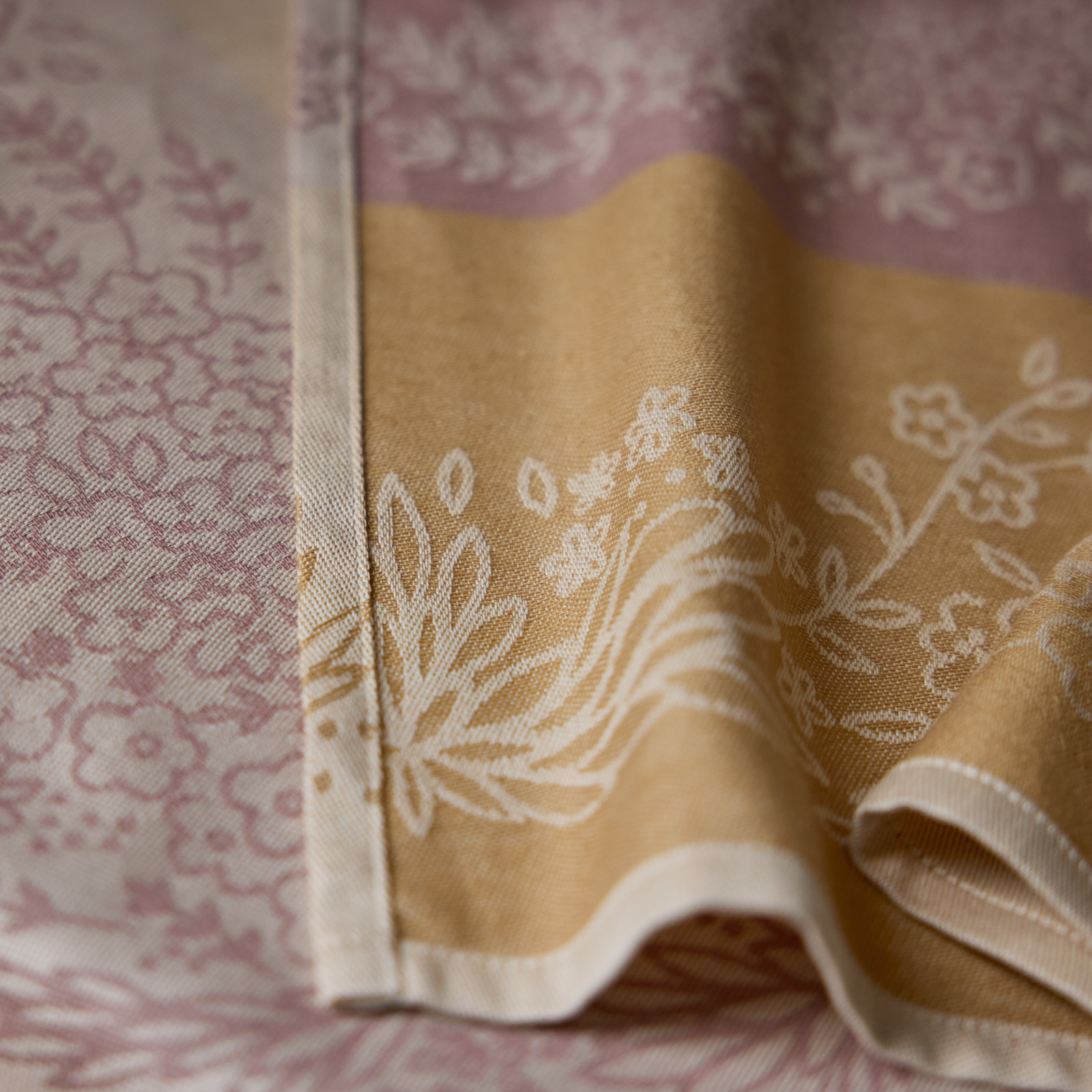 The Biológica Kitchen Towels turn everyday moments into something special, adding a touch of charm. The set includes three jacquard kitchen towels, each with its own distinct character: one in a multicolor version, one in earth rose, and one in amber. Together, they form a balanced trio that combines functionality and aesthetics, designed to bring both beauty and practicality to the kitchen. Inspired by the same pattern as the Ecossistema Tablecloth, the kitchen towels feature an original nature-inspired design with flowers, branches, and leaves woven in jacquard. Their rich composition adds to their exclusivity. Made from BCI cotton combined with nettle fiber, they provide a soft touch, good absorbency, and durability. The nettle fiber adds strength and subtle texture, while the cotton ensures versatility for everyday use. Additionally, their warm and harmonious color palette enhances personality, creating a cheerful and inviting atmosphere in spaces dedicated to sharing and gathering. With the Biológica Kitchen Towels, cooking or caring for the home gains a touch of authenticity.