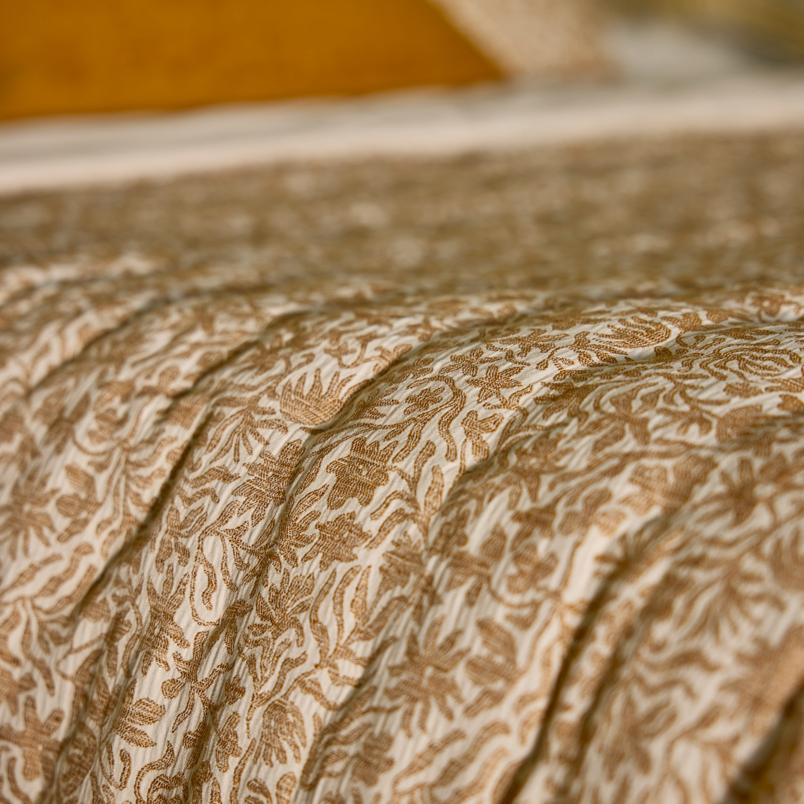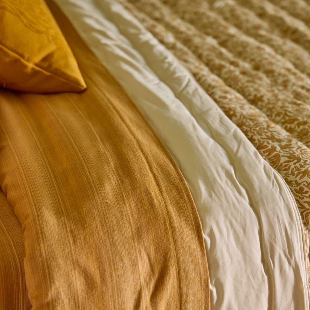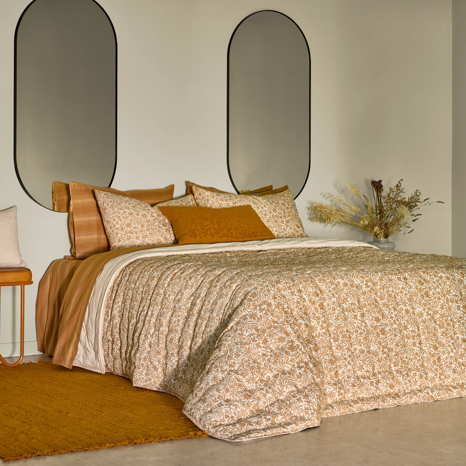 O Quilt Inspira revela-se numa peça de autor, que respira autenticidade. A mistura dos seus tons, branco e âmbar, traz um reflexo de calor e serenidade, evocando a luminosidade da estação do outono e a intensidade terrosa da natureza. O linho na sua composição acrescenta nobreza e uma textura rica, oferecendo-lhe, um visual intemporal e refinado. Em dupla-face, para uma maior versatilidade e flexibilidade de utilização e combinações, esta peça traz uma face com mais personalidade e outra simples e minimalistapara que seja mais fácil decorar e combinar com os diferentes elementos presentes no espaço. Singularidade e exclusividade completam este quilt, graças ao debuxo do seu fio, que acompanha e dá vida ao movimento do desenho e realça o seu traço artístico e a inspiração manual que lhe deram origem. Tal como o nome indica, este quilt, inspira pela sua cor âmbar, quente e envolvente, capaz de transformar o quarto num espaço repleto de tranquilidade. A sua presença inspira calma, enche o quarto de serenidade e deixa que a vida se vista de harmonia. Tal como a respiração, traz equilíbrio e tal como a inspiração, desperta emoções.